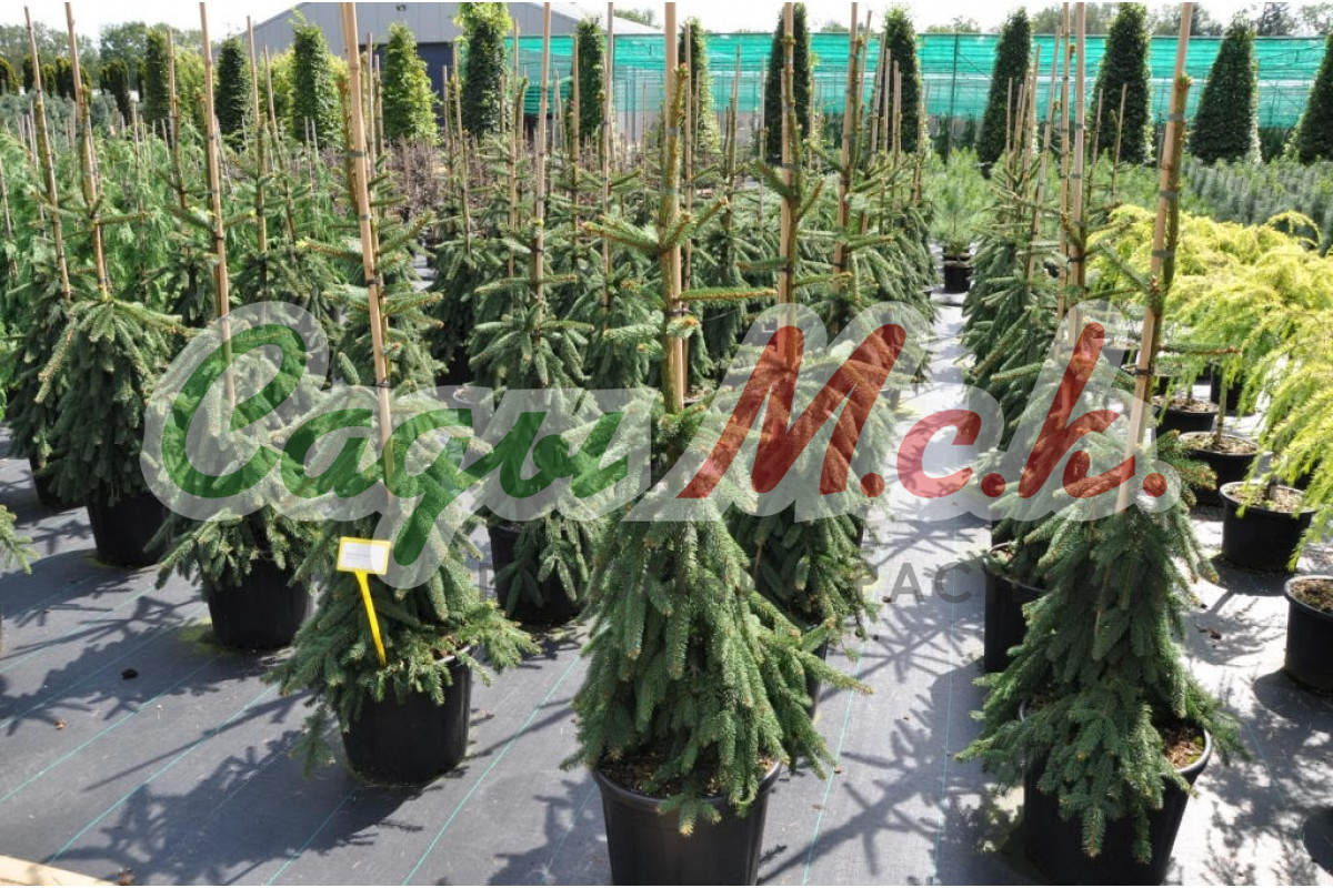 Медленно-растущее хвойное дерево с плакучей колоновидной формой кроны. Ветви и побеги повислые, ниспадающие вниз, нижние ветви красиво распластаны шлейфом по земле. Верхушка имеет заваливающийся характер роста.