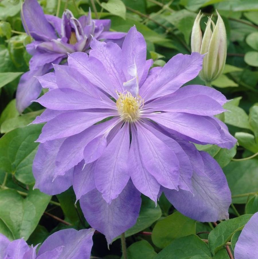 Клематис Countess of lovelace - деревянистая лиана высотой 2-3 метра. Цветки голубовато-фиолетово-розовые, иногда с голубым оттенком, диаметром до 16 см. Лепестки острозаканчивающиеся. Тычинки состоят из желтых пыльников на белых нитях. Цветки махровые в мае-июне (на прошлогодних побегах) и одиночные в августе (на побегах этого года). Сорт достаточно быстрорастущий. Может плестись по натуральным опорам.