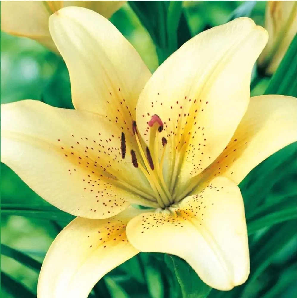 Лилия Bestseller - растение высотой 105 см. Цветок кремовый, с темным крапом и желтым центром, крупный. Диаметр цветка - 16 см. Цветки смотрят вверх. Цветет растение в конце июля. Сорт зимостойкий, не требует укрытия на зиму. Предпочитает солнце и полутень.