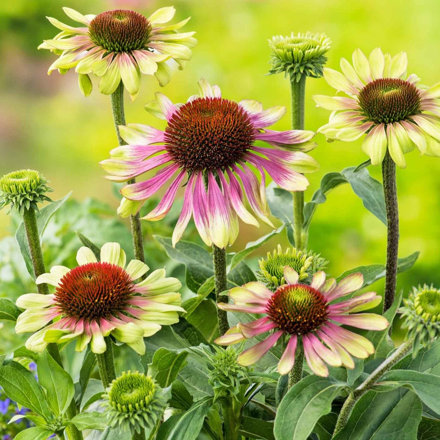 Эхинацея пурпурная Грин Твистер (Green Twister) привлекает садоводов необычной окраской соцветий и неприхотливостью. Лепестки цветков, похожих на крупные ромашки, имеют сиренево-розовый цвет основания и жёлто-зелёные кончики. Центр бутона бордовый, густо покрыт короткими тычинками, отчего кажется пушистым. Цветок сажают в компании с васильками, астрами, корейскими хризантемами, мальвой, тысячелистником. Высота крепкого стебля эхинацеи равна 1метру, диаметр соцветия более 10 сантиметров. Цветение длится с июля и до заморозков. Эхинацея пурпурная Грин Твистер не требует для высадки плодородных почв, хорошо растёт в полутени, цветок засухоустойчив.