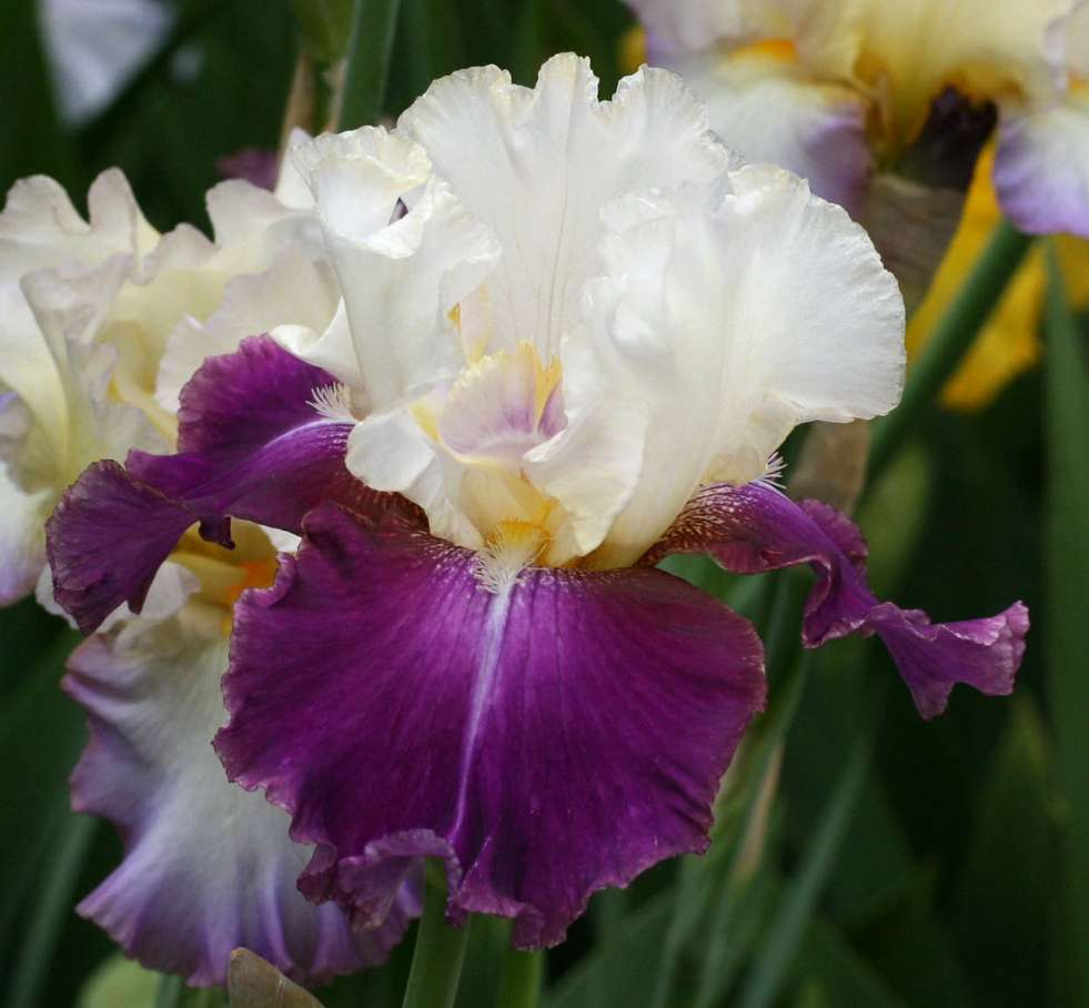 Рассада ириса Calypso Beat позволяет получить крупные цветы с классической контрастной окраской. Этот высокий цветок, мощные цветоносы которого достигают в высоту 97 см. Нижние доли (фолы) парящие, насыщенного малиново-фиолетового цвета с белой центральной линией. Верхние доли (стандарты) – чисто белые, закрытые. Бородка – желтая или лимонная. Лепестки - гофрированные, волнистые. Цветение происходит в поздние сроки. Цветок выразительный с четким делением на цвета.