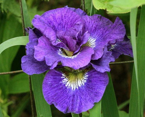 Ирис сибирский Кабум (Kaboom) одна из самых капризных из этого вида растений. Но его удивительной красоты цветки полностью компенсирует затраченное время и ресурсы. На одном цветоносе раскрывается по два бутона за сезон. Многолепестковые махровые цветки имеют сине-фиолетовый окрас с малиновым оттенком в солнечную погоду. На каждом лепестке белое пятно, переходящее в желтое ближе к основанию.