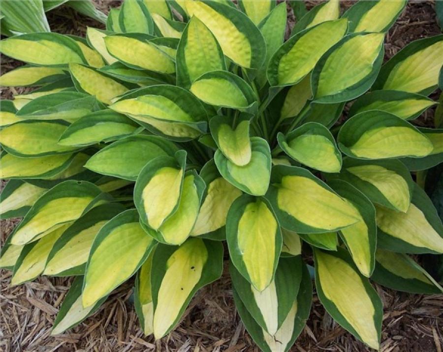 Хоста Gypsy Rose - высота 35-45 см. Ширина куста около 70 см. Листья эллиптические, плотные, слегка жатые, с приподнятыми вверх темно-зелеными краями в виде лодочки. Яблочно-жёлтый центр которых, окаймлён тончайшей белоснежной полоской, край листа – тёмно-зелёный. Цветки светло лавандовые.